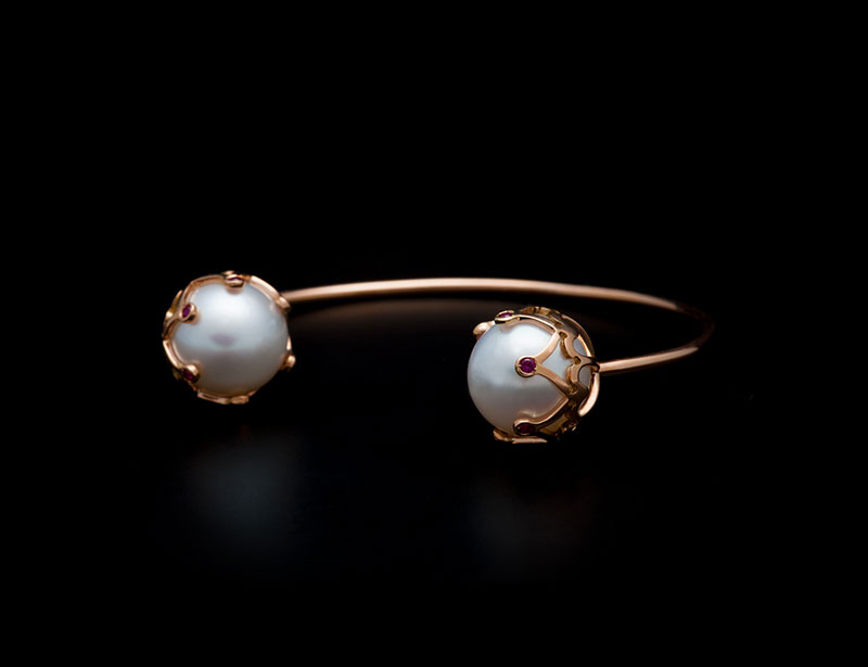 Bracciale in oro rosso 18 kt doppio castone corona con rubini e perle bianche Mare del Sud.