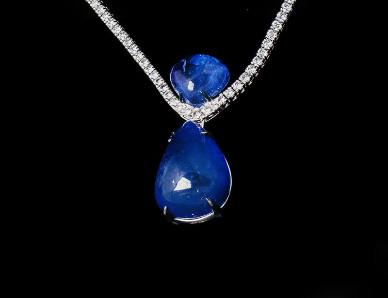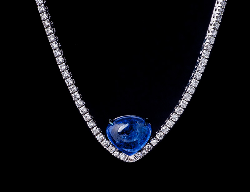 Collana tennis di diamanti bianchi taglio brillante in oro bianco 18 kt con tanzanite naturale taglio trillion centrale. Componibile di pendente a goccia di tanzanite naturale o di ciondolo traforato con tanzanite naturale taglio trillion, incassatura di diamanti bianchi taglio brillante e pavé di zaffiri blu naturali taglio brillante.